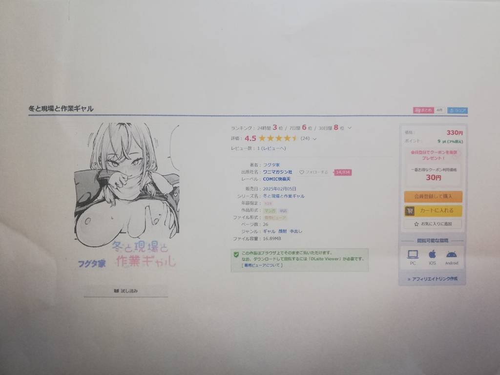 • 『冬と現場と作業ギャル』を読むならDLsiteがおすすめ。音声作品やゲームに使えるクーポンも配布されているので、他の同人作品が欲しくなったときにもお得にお買い物できます。