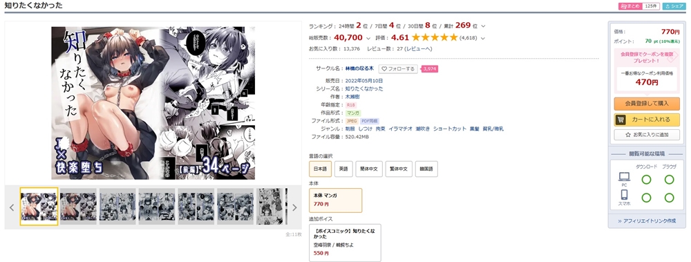 • 『知りたくなかった』を読むならDLsiteがおすすめ。音声作品やゲームに使えるクーポンも配布されているので、他の同人作品が欲しくなったときにもお得にお買い物できます。